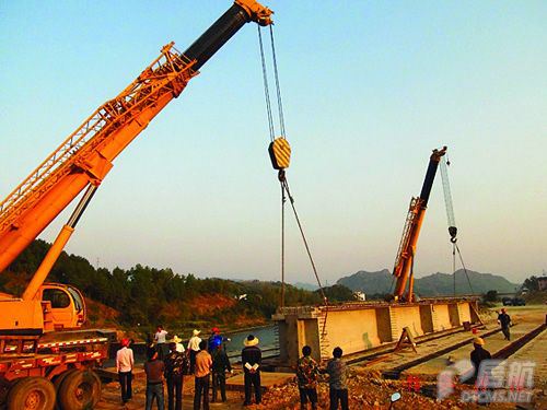 10月11日,在古樟中桥建设现场,两台500吨汽吊正在安装最后一片T型桥梁。该桥长43.5米,宽30米,投资300多万元。我县紧紧抓住《若干意见》出台带来的政策机遇,全力向上争取项目资金扶持,大力推进城乡交通基础设施建设,造福百姓。